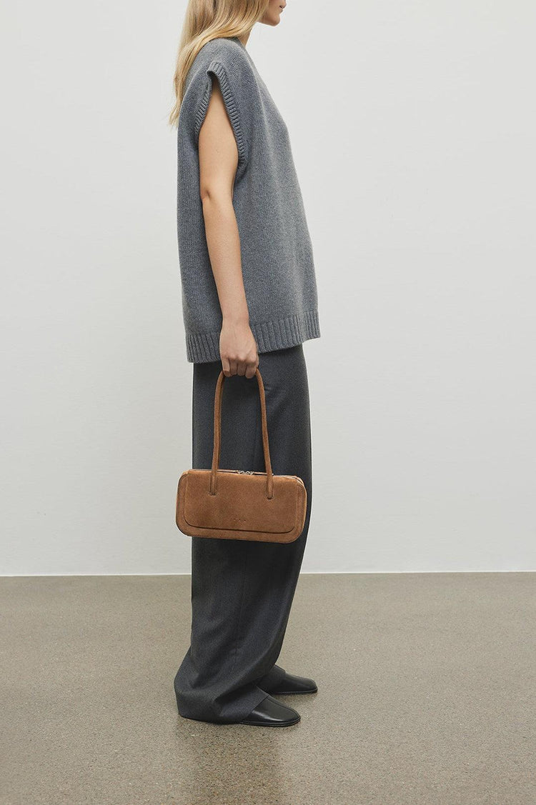 The mini Lagune Bowling bag is a modern take on the classic bowling shape. Made from soft Italian suede calfskin, it features rounded edges and smooth lines. With long handles, it can be carried by hand or worn on the shoulder. The bag includes a zip closure and inner pocket, perfect for daily use or evenings out. Its velvety texture adds subtle depth while keeping a clean, refined look.