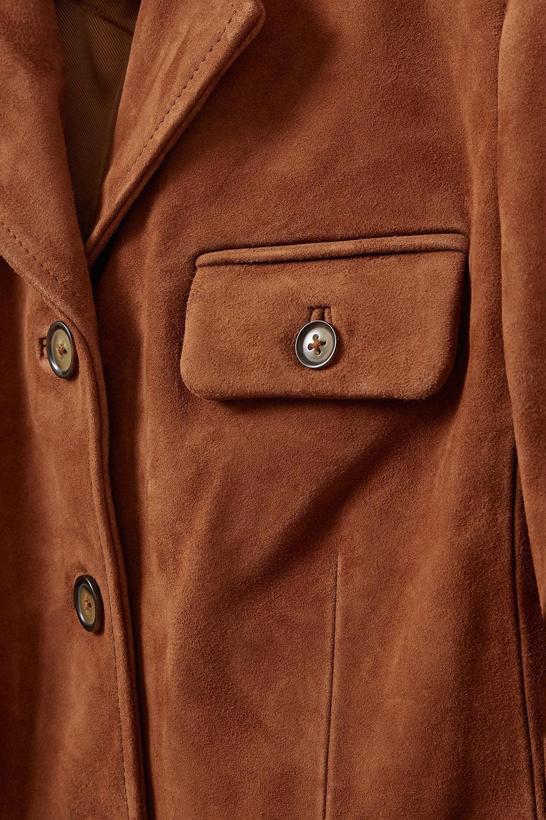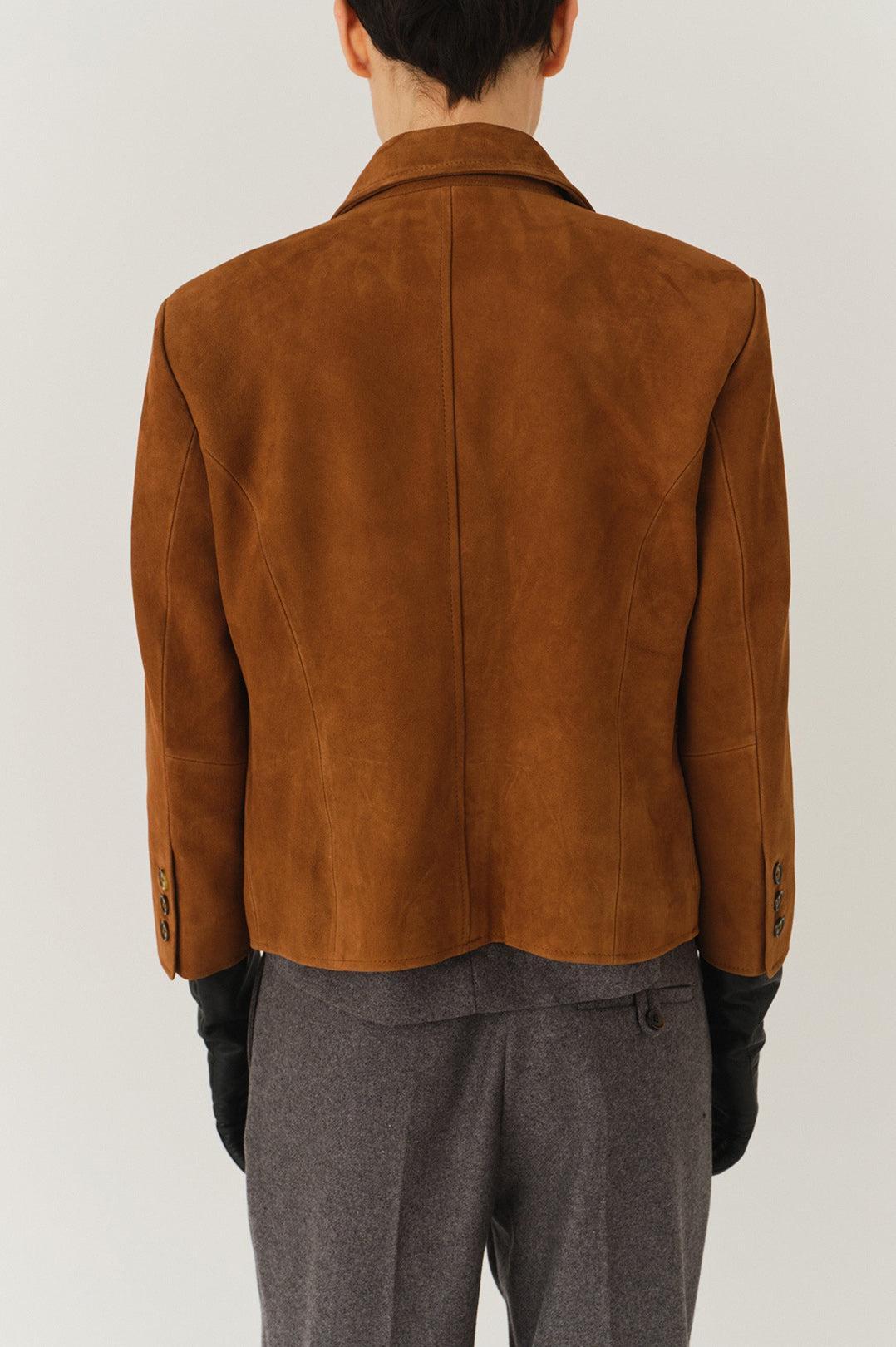 The Suede Fitted Jacket from The Garment, made entirely from goatskin, features a cropped and tailored design that offers a feminine alternative to the traditional oversized blazer. It is detailed with front pockets and a button closure for an elegant finish.